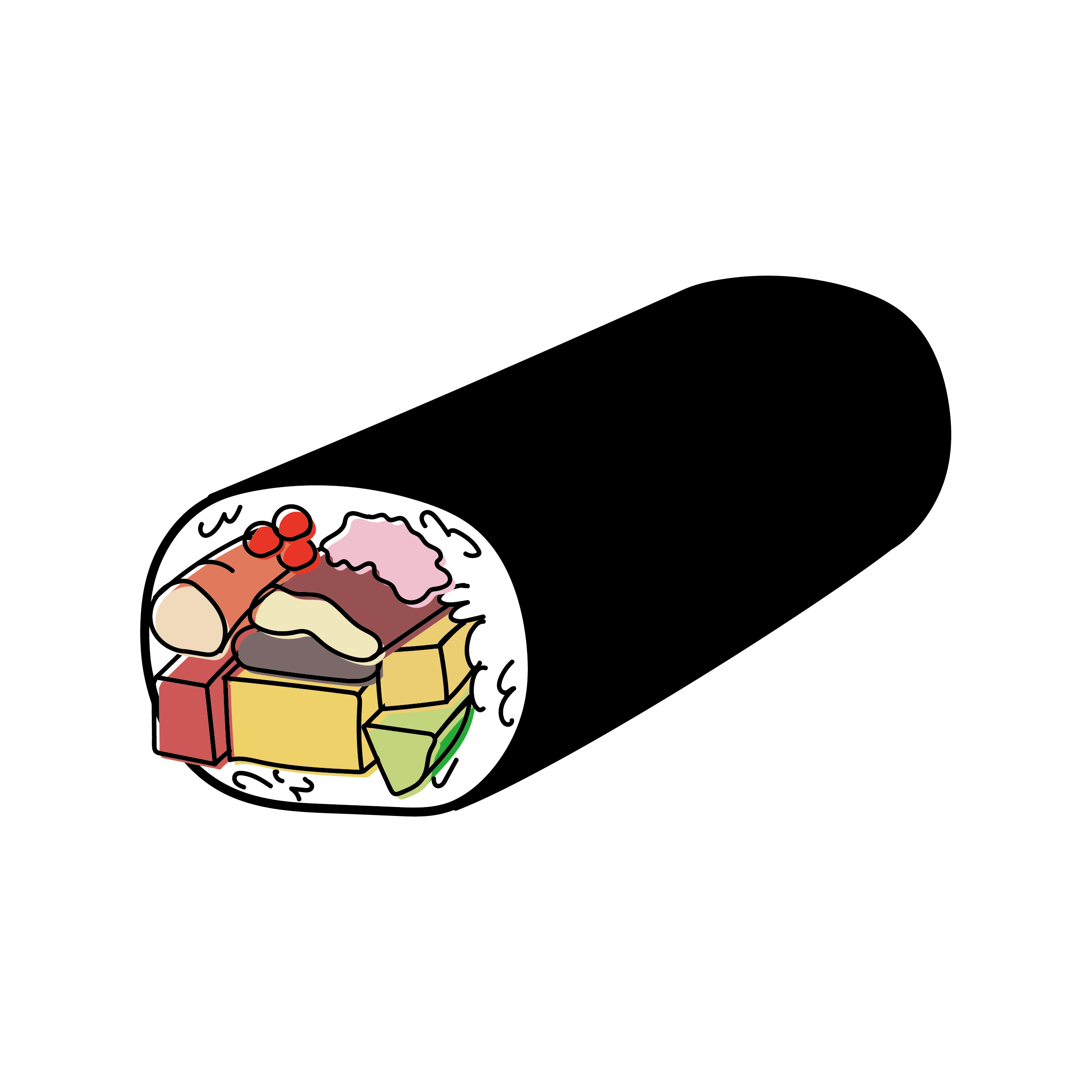 恵方巻き(太巻き)のイラスト モノのイラスト Twitter Facebook はてブ Pocket LINE コピー 2022.10.232022.01.11 海鮮やたまごなどの具材の入った恵方巻きのイラストです。節分や太巻き寿司を表現したい時に使うと便利です。 PNGは背景が透明な画像、JPGは背景が白い画像、EPSはIllustratorなどで色や形を変更できるデータとなっています。用途にあったものをお選びください。 恵方巻き(太巻き)のイラスト 太巻き(恵方巻きのイラスト) PNGでダウンロード JPGでダウンロード