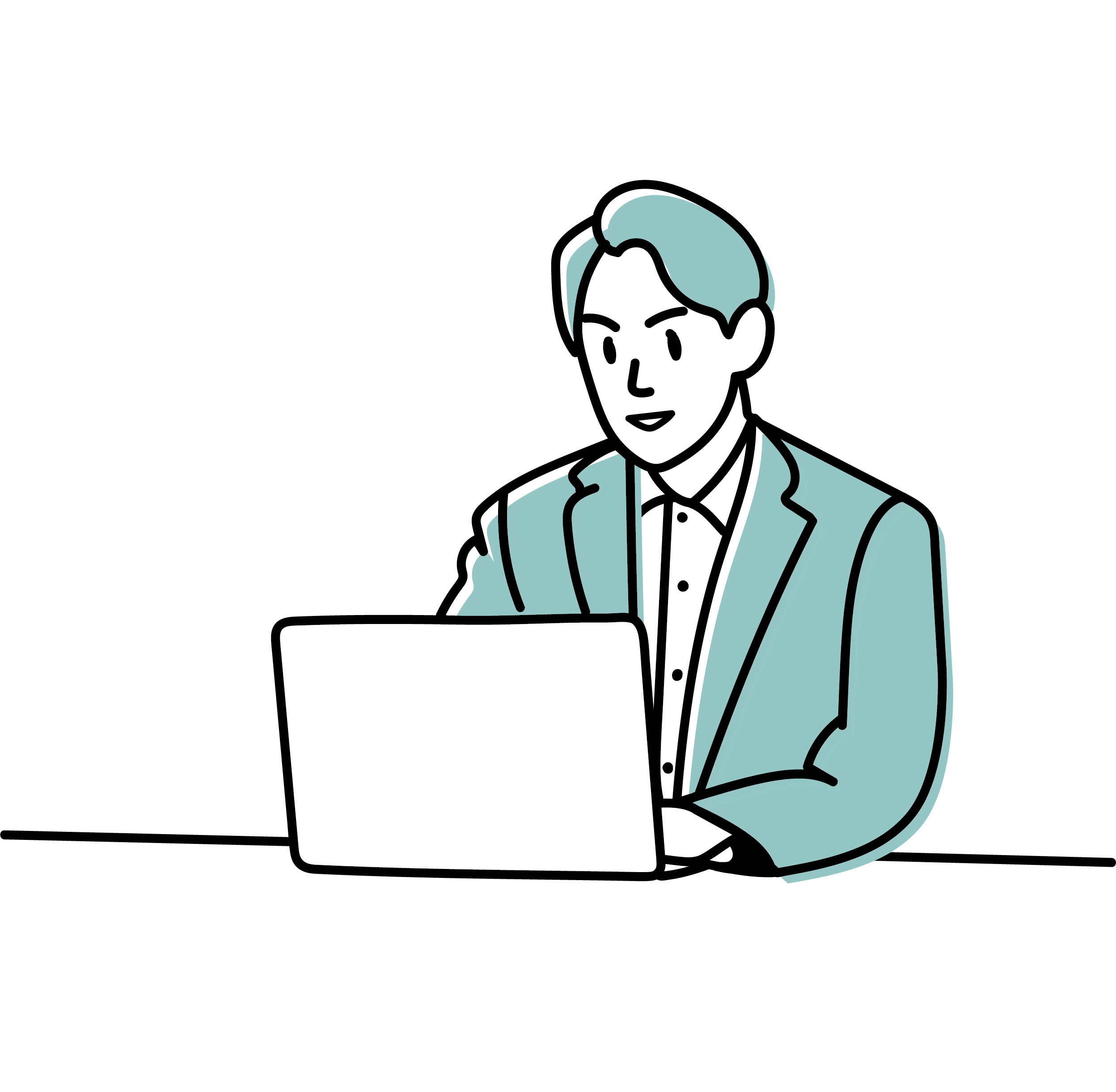 ノートパソコンをデスクで操作する男性のイラストです。パソコンを使う場面や会社員を表現したい時に便利です。